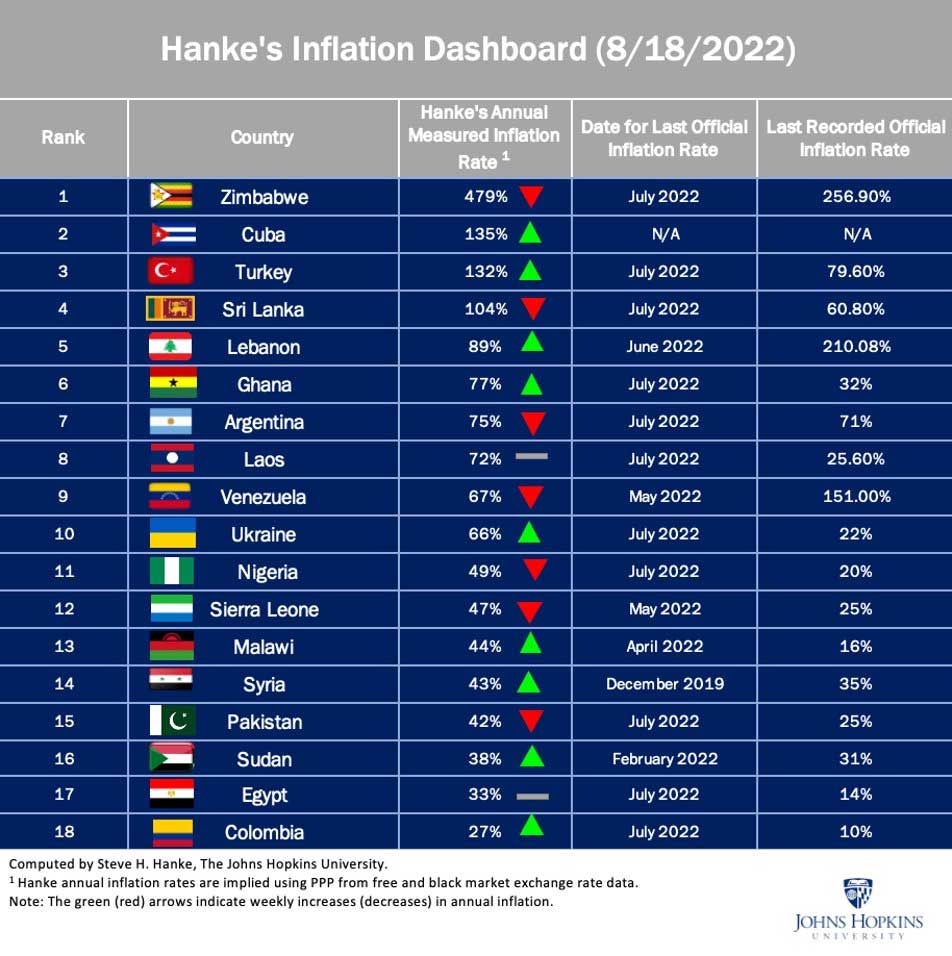 ஸ்டீவ் ஹான்கேயின் சமீபத்திய பணவீக்க சுட்டெண்ணில் இலங்கை நான்காவது இடத்துக்குத் தள்ளப்பட்டுள்ளது.