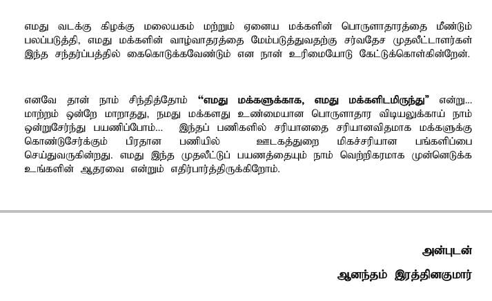 மேற்படி விசேட நியமனத்தைப்பெற்ற கனேடிய வர்த்தகர் திரு.ஆனந்தம் இரத்தினகுமார் தனது இந்த நியமனத்தினூடாக தாம் செயலப்படவுள்ள திட்டங்கள் தொடர்பாக தனது ஊடக அறிக்கை ஒன்றை இன்றயதினம் வெளியிட்டுள்ளார்.