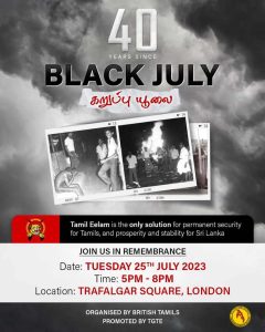 ஈழம் அமைதலே தமிழ் மக்களின் நிரந்தர பாதுகாப்பிற்கான ஒரே தீர்வு அத்துடன் இலங்கையில் சுபீட்சத்துக்கும் ஸ்திரத்தன்மைக்குமான பாதையும் இதுவேதான் என்ற கருப்பொருளை மையமாகக் கொண்டு ஒன்று திரண்ட புலம்பெயர் தமிழர்கள் பிரித்தானிய அரசிற்கும் சர்வதேசத்துக்கும் தமது கோரிக்கைகளை முன்வைத்தனர்.கறுப்பு ;ஜூலை படுகொலை இடம்பெற்று 40 ஆண்டுகால நினைவு நாளை முன்னிட்டு பிரித்தானியாவின் பெருநகர மத்தியில் திரண்ட புலம்பெயர் தமிழர்கள் நீதி கோரி எழுச்சி பேரணி ஒன்றை நடத்தினர்.