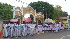 பாடசாலைக்கு அபகீர்த்தி ஏற்படுத்தாதே, கற்பிக்க வந்த இடத்தில் கள்ளத்தனம் எதற்கு, பாடசாலைக்குள் நடப்பது பாடத்திட்டமா அல்லது படப்பிடிப்பா போன்ற வாசகங்கள் அடங்கிய பதாகைகளை மாணவர்கள் தாங்கியிருந்தனர்.