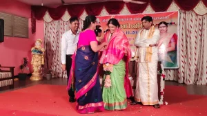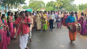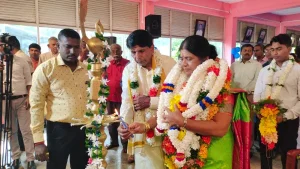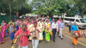 கிளிநொச்சி பிள்ளையார் ஆலயத்தில் இடம்பெற்ற விசேட வழிபாட்டினை தொடர்ந்து, மணிவிழா நாயகியான பாடசாலை முதல்வருக்கு மலர் மாலை அணிவித்து பாடசாலை மண்டபத்திற்கு அழைத்து செல்லப்பட்டார்.