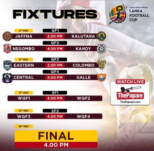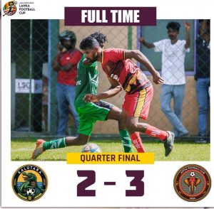 தற்போது நடைபெற்று வருகின்ற அகில இலங்கை ரீதியிலான லங்கா கால்பந்தாட்ட கிண்ணம் 2024 தொடரில் இன்று நடைபெற்ற காலிறுதிப்போட்டியில் களுத்துறை மாவட்ட அணியை எதிர்கொண்ட யாழ்ப்பாணம் மாவட்ட அணி 3- 2 என்ற கோல்கள் அடிப்படையில் அபார வெற்றி பெற்று லங்கா கிண்ணத்தொடரின் அரையிறுதிப்போட்டிக்கு தெரிவாகியுள்ளது.