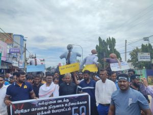 அரச அதிகாரிகள் மற்றும் அரசியல்வாதிகளினுடைய ஊழல் செயற்பாடுகளை கண்டித்து கொடும்பாவிகளினுடைய பொம்மைக்கு பூசணிக்காய் வெட்டி மதச் சடங்குகள் மேற்கொள்ளப்பட்டு 4000 பேர் உள்ளடங்கிய கவனயீர்ப்பு போராட்டம் முன்னெடுக்கப்பட்டது .